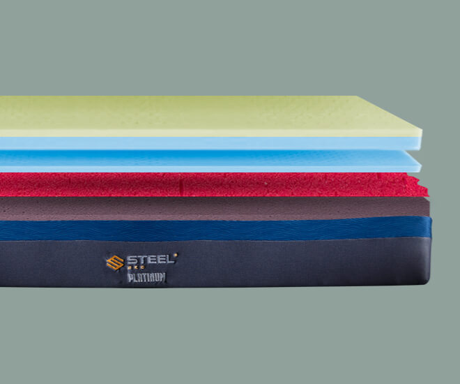 Matras Steel foam terbuat dari 4 lapis foam Untuk menghasilkan konsep 7 Zone yang dapat menopang beban bobot tubuh secara sempurna daN teknologi Airflow yang memberikan sirkulasi udara Agar matras lebih dingin.